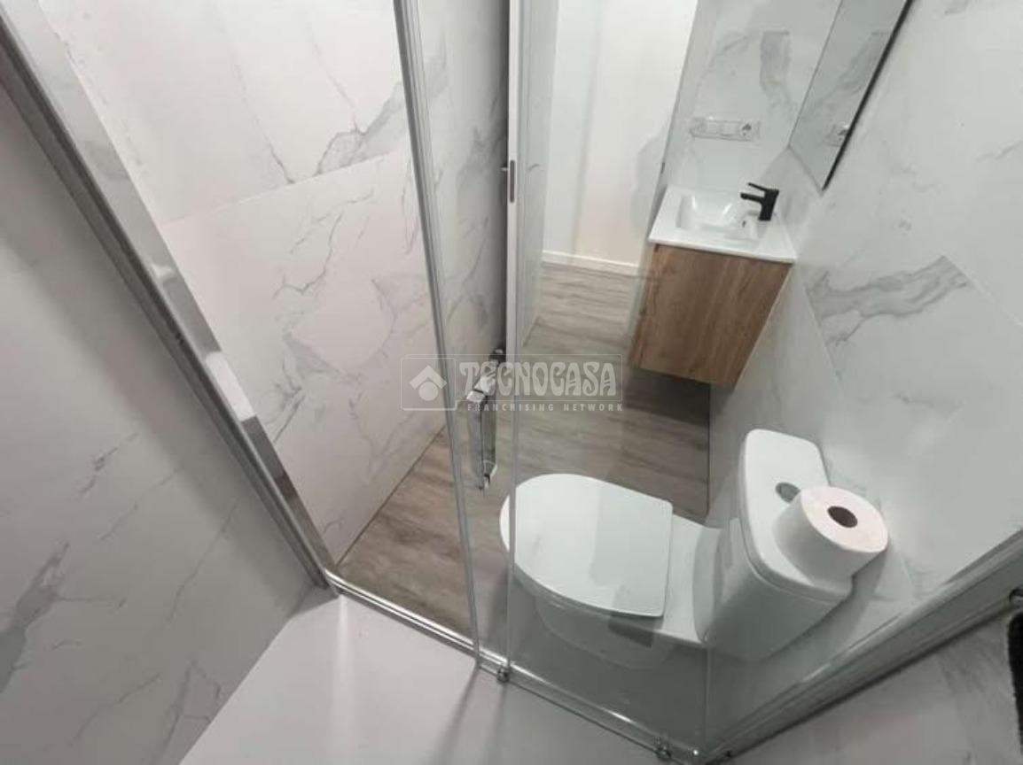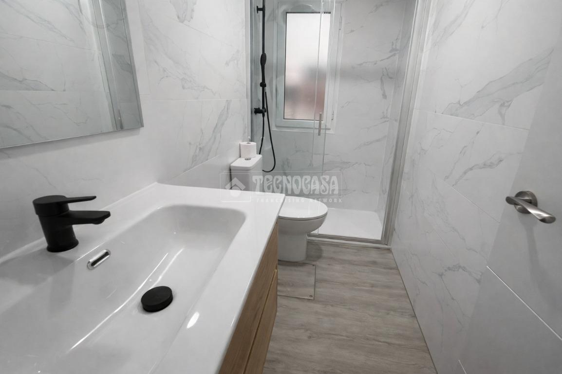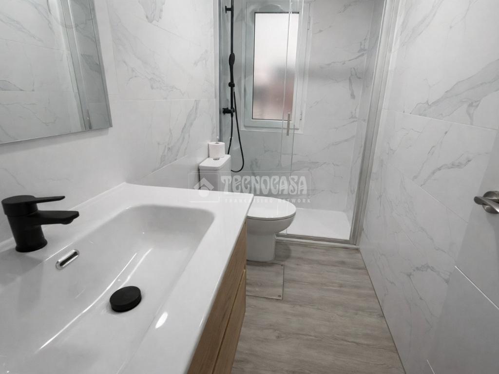 El baño, con alicatado que imita al mármol veteado con baldosa de gran tamaño, lo que le da un aire de modernidad y lo hace a su vez más luminoso. Grifería monomando en negro con gran alcachofa en la ducha. Baño con ventana.