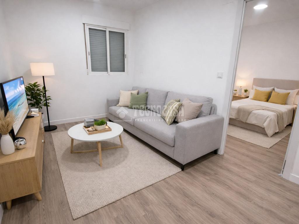 El salón , con ventana exterior, desemboca en la cocina, también con ventana, que facilita la ventilación cruzada de la estancia. Frigorífico, horno, placa de cocina y campana incluída.